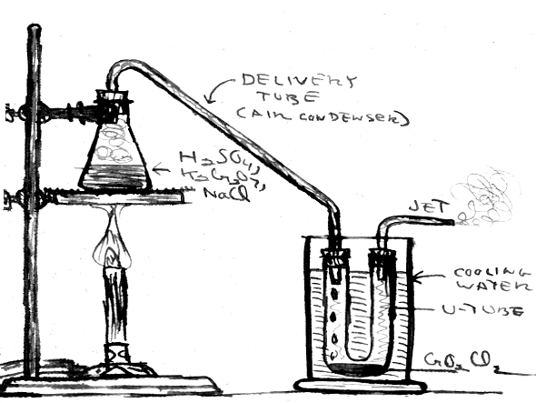 It is not a difficult matter to prepare small quantities of this reactive liquid in the home laboratory.  The chromyl chloride (b.p. 117 C) is recovered by distillation from the reaction mixture.  Since the vapor and liquid attack organic materials (including rubber stoppers) it is preferable to work with all glass apparatus. If you're fortunate enough to own or have access to a good selection of standard taper ground joint ware, or that venerable symbol of the chemist, a glass retort, then you'r e all set.  Otherwise, don't despair; I used the apparatus shown in Figure 2 with satisfactory results.  Rubber stoppers were used; these may have to be replaced after one or two uses in the corrosive environment. Applying a thin coating of silicone stopcock grease may retard attack The air condenser was bent from a length of glass tubing.  I recommend neon sign tubing, which is easily worked in a gas flame.  If you have some glass working expertise, you can blow a bulb in the riser to serve as a trap for any liquid that may spurt over.  The condensed CrO2Cl2 is collected in a U-tube cooled by immersion in a jar of cold water.