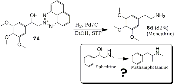 Besides being a very ridiculous nano-scale reaction, doesn't the successful reduction of 7d to 8d that the same reaction conditions would be applicable for the reduction of (pseudo)ephedrine to methamphetamine? And if not, why not?