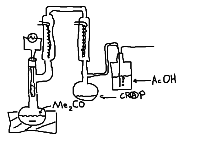The top of the condenser was attached to another condenser (with ice cold water running through it) leading down to another 2 neck flask serving as an acetone trap.  The 2nd neck of this trap flask was attached to a bubbler set up so that the gasses were bubbled through GAA and finally exhausted to a propane burner.