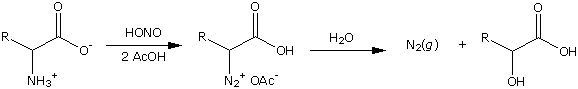 It looks like adding nitrous acid to NH2-CH(R)-COOH will make HO-CH(R)-COOH as in: