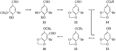 5-Bromoprotocatechualdehyde (11) was obtained from 5-bromovanillin quantitatively by applying the method which Lange reported for the cleavage of various alkyl o-hydroxyphenyl ethers. This bromoaldehyde (11) was treated with methylene iodide in dimethylsulfoxide (DMSO) in the presence of anhydrous potassium carbonate to give 5-bromopiperonal (12) in 38.8% yield. The Baeyer-Villiger oxidation of 5-bromopiperonal (12) with performic acid gave 5-bromosesamol (13), mp 102-104°C, in 78.8% yield, accompanied by a small amount (0.6%) of 5-bromopiperonylic acid (14). Methylation of 5-bromosesamol (13) in the usual way gave 1-bromo-5-methoxy-2,3-methylenedioxybenzene (15), mp 49-51°C, in 96.5% yield. Treatment of this methoxybenzene (15) with phosphorus oxychloride and dimethylformamide (DMF) gave 2-bromo-6-methoxy-3,4-methylenedioxybenzaldehyde (16), mp 208-209°C, as the sole product in 91.5% yield.