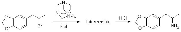 Dissolve 140g (1 mole) of hexamethylenetetramine (urotropine, hexamine) and 157.5g (1.05 moles) sodium iodide (or 174g (1.05 moles) potassium iodide) in 1000ml of hot 95% ethyl alcohol (190 proof grain alcohol). 243g of bromosafrole (1 mole) is then added and the solution is allowed to stand until no precipitation occurs. A stream of HCl gas is then run into the mixture where the precipitate is hydrolyzed, dissolves and ammonium chloride precipitates. The ammonium chloride is filtered off and the alcohol of the filtrate is removed through distillation under reduced pressure. Purify the crude amine left by releasing the free base with NaOH solution (45g NaOH in 135 ml water). Extract the oil with ether (or toluene, methylene chloride etc.) and reconvert to the HCl salt with a stream of HCl gas. Filter the crystals formed from the ether.