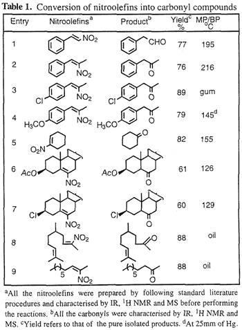 In order to explore the versatility of this reducing system as well as our continued interest on the chemistry of nitroalphatics, 17 we attempted reduction of the nitroolefins to saturated nitroalkanes by using the Al-NiCl2-6H2O-THF system.  However, we observed that the products of the reactions were not the saturated nitroalkanes, instead we observed the corresponding carbonyl compounds were obtained in excellent yield.