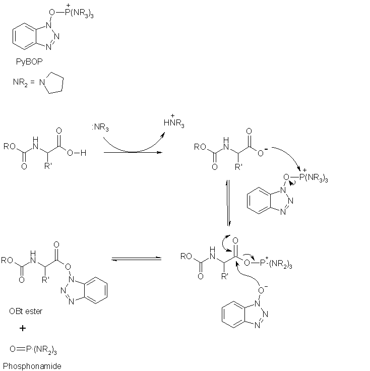 Phosphonium salt couplers are used in tandem with a tertiary amine base which abstracts the acidic carboxyl proton. The generated carboxylate anion attacks the positively charged phosphorous atom, substituting for the benzotriazolyl group. The benzotriazolyl anion itself acts as a nucleophile at the acyl centre. In the resulting substitution reaction the OBt ester and a phosphonamide are formed.